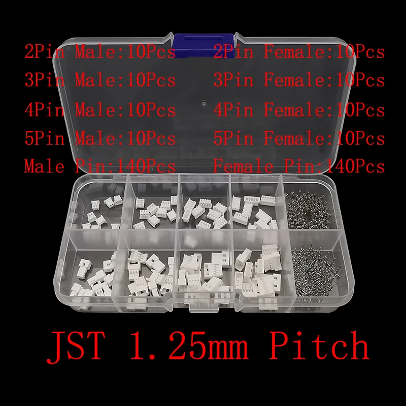 JST SH 1.0mm, JST 1.25mm, PH 2.0mm, SM/SYP/XH 2.54mm et VH 3.96mm.